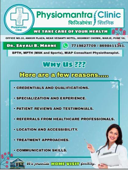 Dr. Sayali Marne, a trusted Physiotherapist in Warje, Pune. Welcomes you to Physiomantra Clinic, where expert care meets compassion. With a Master’s in Physiotherapy, she provides effective treatments for knee pain, shoulder pain, back pain, and spine disorders. Specialized therapies are available for sciatica, slip disc, arthritis, joint stiffness, and sports injuries, ensuring faster recovery a...